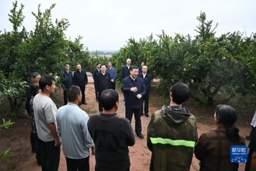 9月24日,中共中央總書記、國(guó)家主席、中央軍委主席習(xí)近平在浙江考察結(jié)束返京途中,來(lái)到山東省棗莊市考察。這是習(xí)近平在位于嶧城區(qū)的冠世榴園石榴種植園了解石榴產(chǎn)業(yè)發(fā)展情況。新華社記者燕雁攝