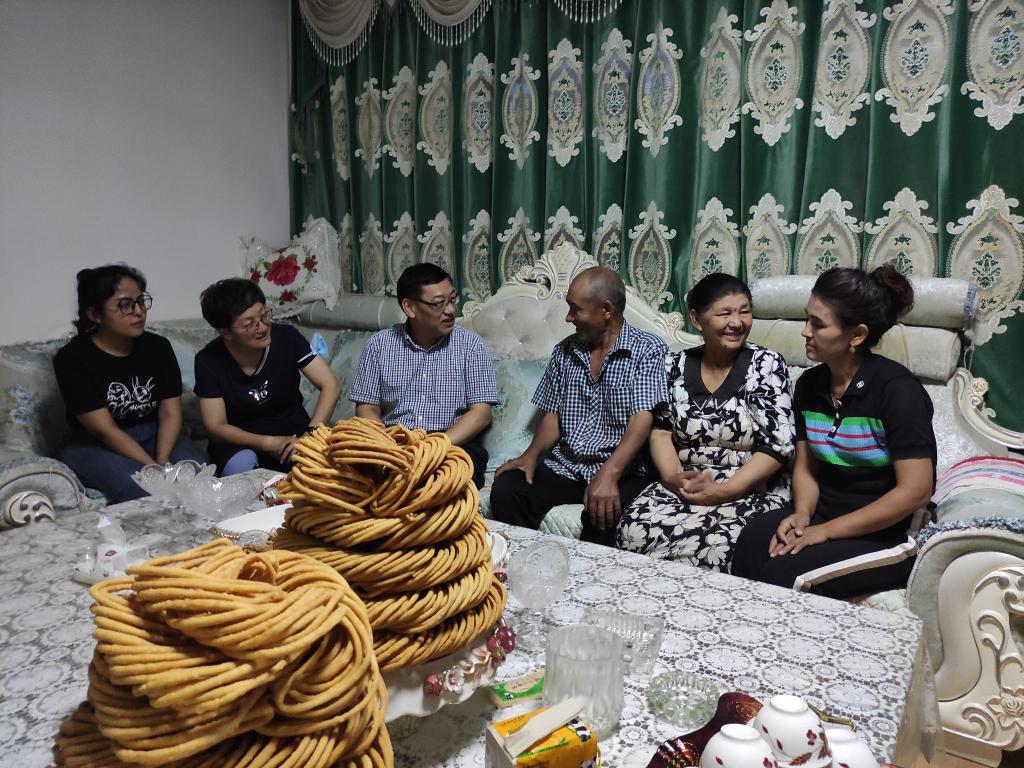 在農戶代表麥提托合提家,各色干果擺滿了餐桌,剛炸好的馓子也端了上來,寬敞的房子里充滿了濃濃的節日氣氛。麥提托合提熱情的招呼大家品嘗馓子,高興的向大家介紹今年產業發展的情況,總領隊李永晟充分肯定了他對村里產業發展的貢獻,鼓勵他繼續發揮產業帶頭人的優勢,帶動更多的村民走上致富的道路,把日子過得更加紅火。
