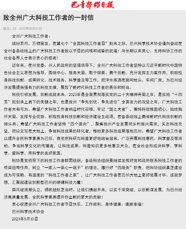 繽紛五月,萬物競發。在第七個“全國科技工作者日”到來之際,巴州科學技術協會謹向奮戰在全州各條戰線上的廣大科技工作者致以節日的問候和誠摯的祝福!向長期以來關心、支持科協工作的社會各界人士表示衷心的感謝!