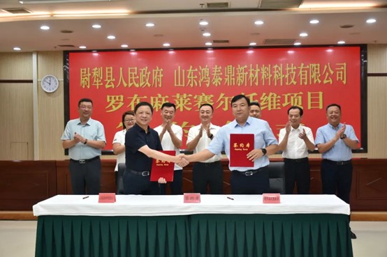 8月25日,尉犁縣人民政府與山東鴻泰鼎新材料科技有限公司舉行羅布麻萊賽爾纖維項目戰略合作簽約儀式,尉犁縣委副書記、縣長木合塔爾·絲迪克與山東鴻泰鼎新材料科技有限公司董事長王培榮代表雙方簽署協議。
