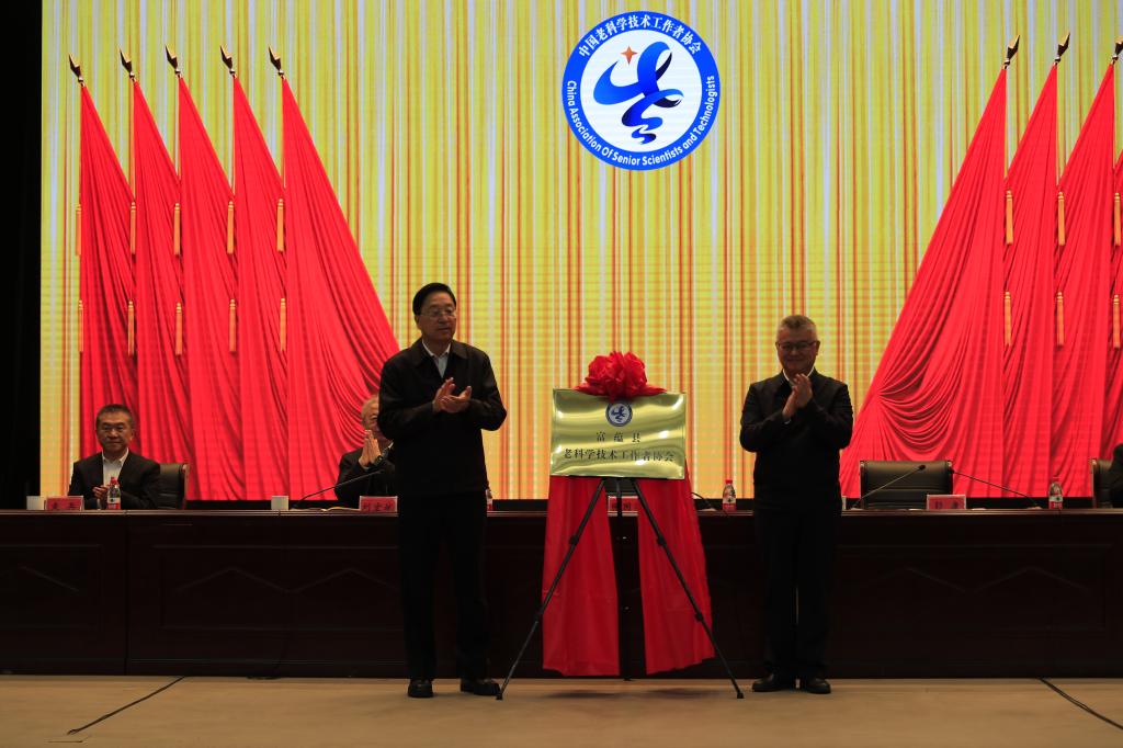會議在莊嚴的國歌聲中拉開序幕,張國梁和彭康共同為富蘊縣老科學技術工作者協會揭牌。