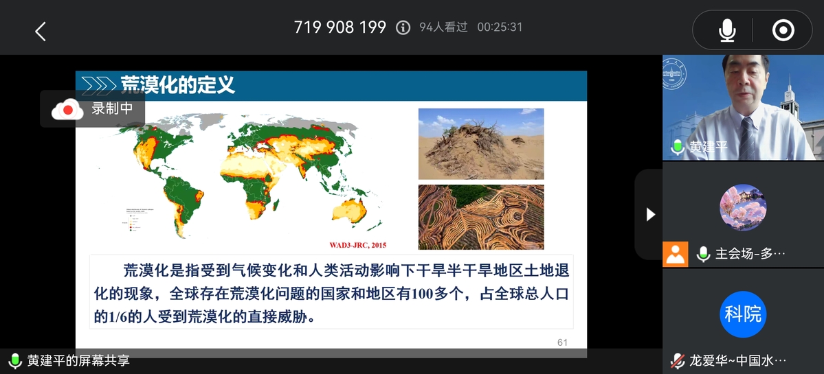 主旨報告環節,中國科學院院士、蘭州大學教授黃建平,中國科學院院士、中科院新疆分院院長肖文交等分別圍繞“干旱區氣候變化”和“天山地貌格局演化”議題作了精彩報告。特邀報告環節,邀請到了西北大學張世強教授、中科院空天信息創新研究院邱玉寶研究員、中國水利水電科學研究院龍愛華研究員及北京大學邱國玉教授等分別作了題為“寒區流域混合產流機制對比試驗研究”、“雪冰數據產品及信息服務”、“西北內陸區‘自然-社會-貿易’水循環理論方法及應用探索”、“大數據和人工智能時代荒漠植被調查的再思考與新嘗試”的學術報告。