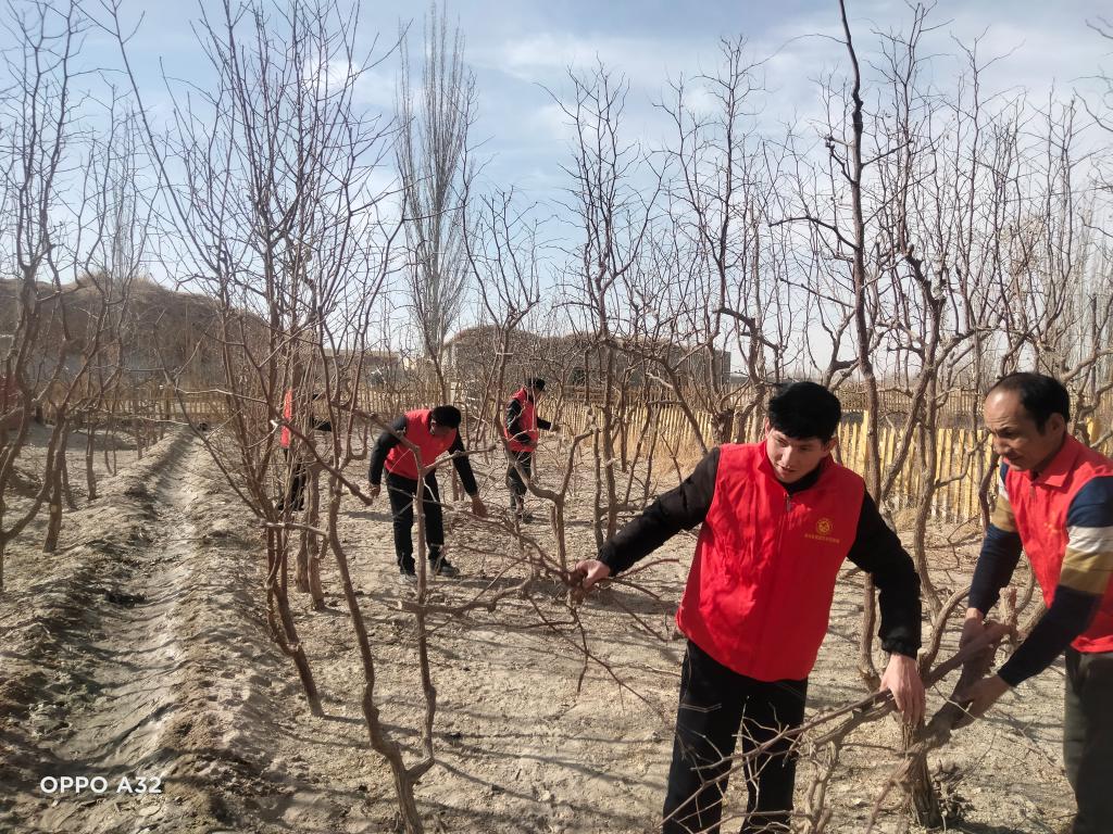 志愿者服務隊首先來到村內帕太姆罕老人家,帕太姆罕老人今年已有81歲高齡,患有哮喘病,老伴于早年去世,目前和孫子生活在一起。由于年齡較大,加上患有哮喘,行動不是太便利,志愿者就合力幫其將院子后面的紅棗樹進行了修剪,并將其庭院環境、室內衛生一一進行了整理。