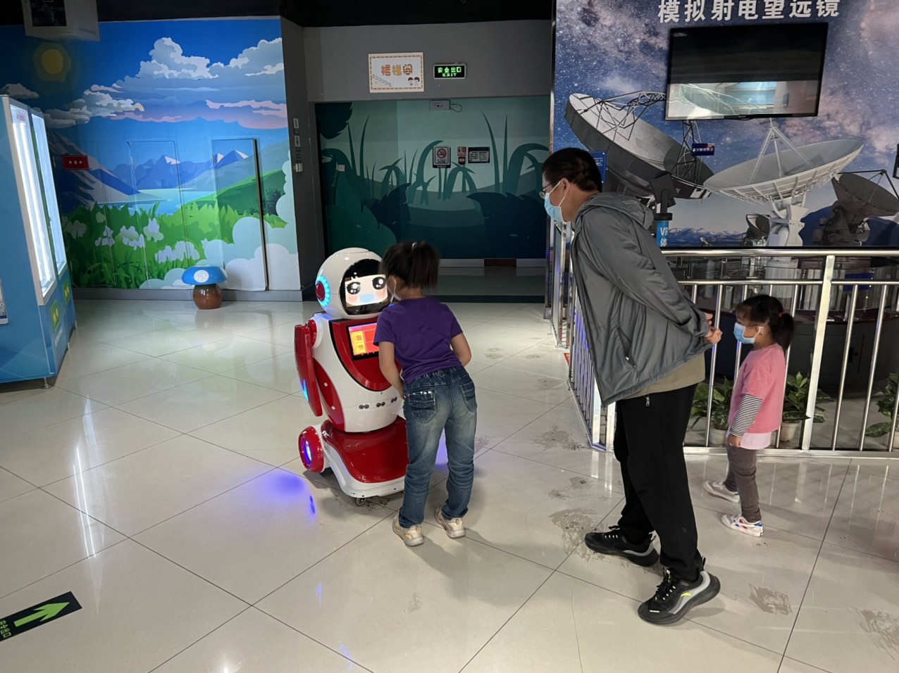 位于展區一層的大屏機器人負責引導觀眾參觀游覽,它可以提供貼心細致的講解和引路服務,智能識別觀眾是否規范佩戴口罩并做好溫馨提示。位于二樓三樓的兩個智能教育機器人,外形乖巧可愛,頭腦機智靈活,一個穿黃衣、一個著紅裙,可以講搞笑段子,會做可愛賣萌的表情,能搖頭晃腦地為大家唱歌,也能與觀眾交流互動、解疑答惑,聰明可愛的模樣非常受小朋友喜愛。