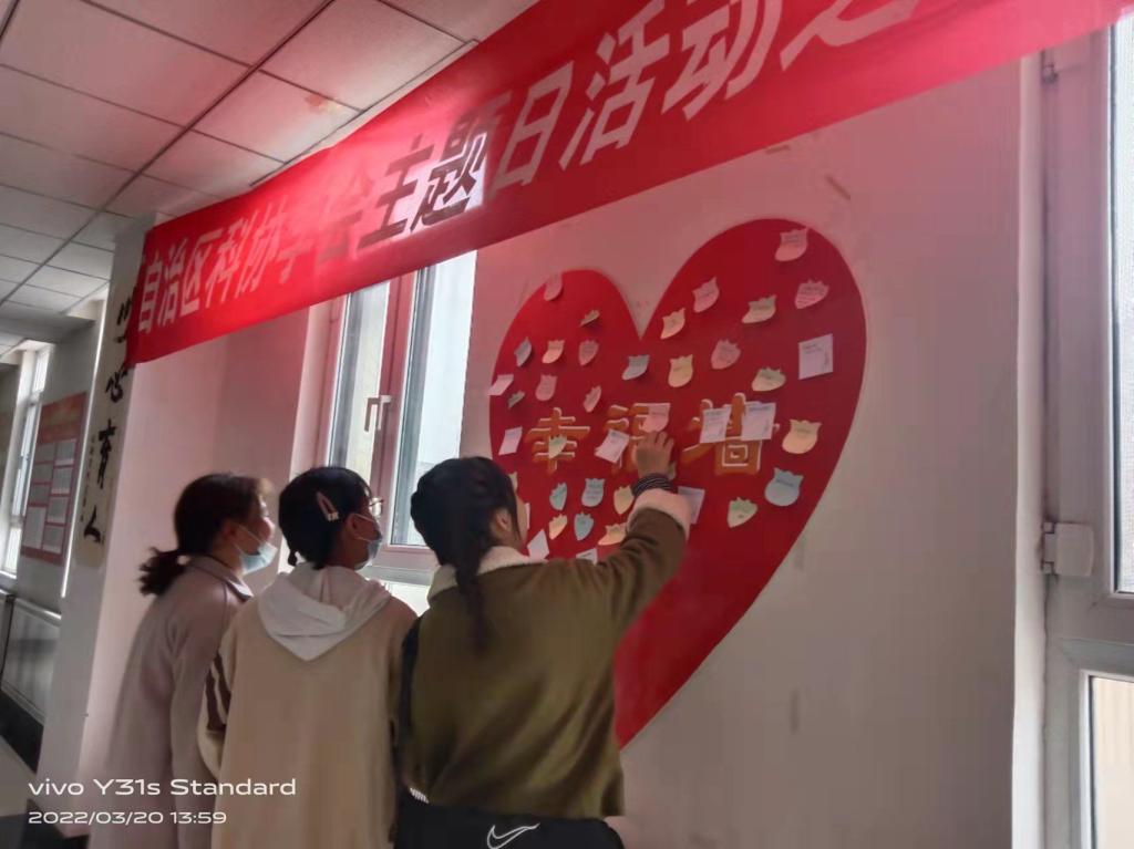 3月20日上午,新疆心理學會與新疆師范大學心理學院共同舉辦“分享我的幸福時刻”為主題的圖片展覽活動?;顒又?,同學們用拍照的方式記錄了自己最幸福的時刻,并與其他同學分享自己的幸福。與此同時,同學們在“幸福墻”上寫下祝福,祝福自己以及父母、老師等幸??鞓?。