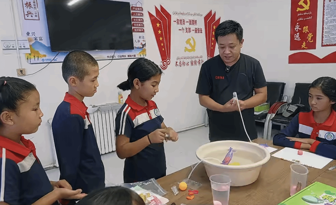 當勒克蒙加克村的駐村工作隊員化身為“科學老師”,帶領孩子們走進了一個個奇妙的科學世界。《螃蟹眼睛的啟示》課堂上,圖片里螃蟹那雙能360度旋轉的眼睛,讓孩子們驚嘆不已,眼神中滿是新奇;《魚的啟示》講解時,魚鰭與船槳的巧妙聯系被揭曉,孩子們仿佛瞬間明白了這藏在生活里的科學奧秘。講到潛水艇的原理,工作隊員拿起裝滿水的瓶子演示上浮下沉,瓶身的每一次浮動都牽動著孩子們的目光,他們瞪大眼睛,仿佛自己也化作了穿梭水中的“小小潛水員”。