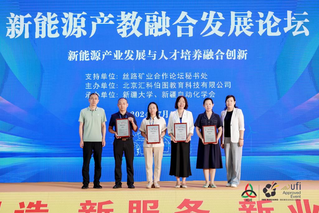 在產教融合合作成果儀式環節,北京匯科伯圖教育科技有限公司總經理王少燕為新疆大學電氣工程學院副院長,教授,博導安毅;新疆大學電氣工程學院產學研辦公室主任,教授,博導謝麗蓉;新疆工程學院控制工程學院黨委書記,享受國務院特殊津貼專家徐立軍頒發產教融合特聘導師榮譽證書。