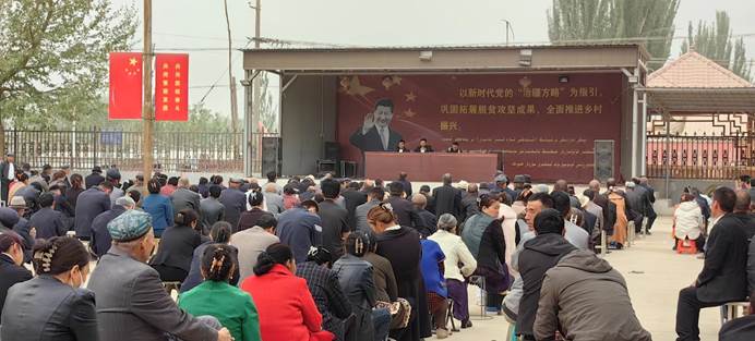 4月15日,在嘹亮的國(guó)歌聲里五星紅旗緩緩升起,學(xué)會(huì)聯(lián)合宣傳小組與村民們一起莊嚴(yán)宣誓“忠于我的祖國(guó)和人民,遵守憲法和法律……”。在國(guó)旗下,村民艾買(mǎi)提、米熱古麗等4人走上前臺(tái),用親身經(jīng)歷向大家一起分享掌握國(guó)家通用語(yǔ)言文字給自己生活、工作中帶來(lái)的好處。新疆微生物學(xué)會(huì)秘書(shū)長(zhǎng)、駐村工作隊(duì)副隊(duì)長(zhǎng)張志東對(duì)上臺(tái)演講的村民給于了高度的肯定,并再次強(qiáng)調(diào)學(xué)習(xí)用好國(guó)家通用語(yǔ)言文字對(duì)于鑄牢中華民族共同體意識(shí)的重要意義,并鼓勵(lì)大家自覺(jué)地、堅(jiān)定地使用國(guó)家通用語(yǔ)言文字,積極建設(shè)平安鄉(xiāng)村,構(gòu)建和諧社會(huì),為中華民族偉大復(fù)興作出應(yīng)有貢獻(xiàn)。