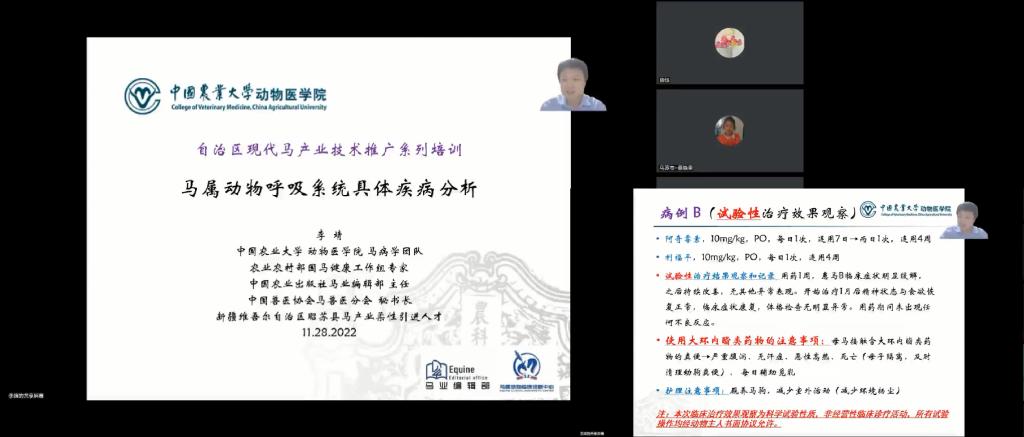 11月28日——馬屬動物呼吸系統具體疾病分析,由中國農業大學李靖老師授課。通過向我們介紹四例臨床癥狀,清晰明了地講述幼駒、成年馬肺炎在生產實際中的診斷、治療和預防。