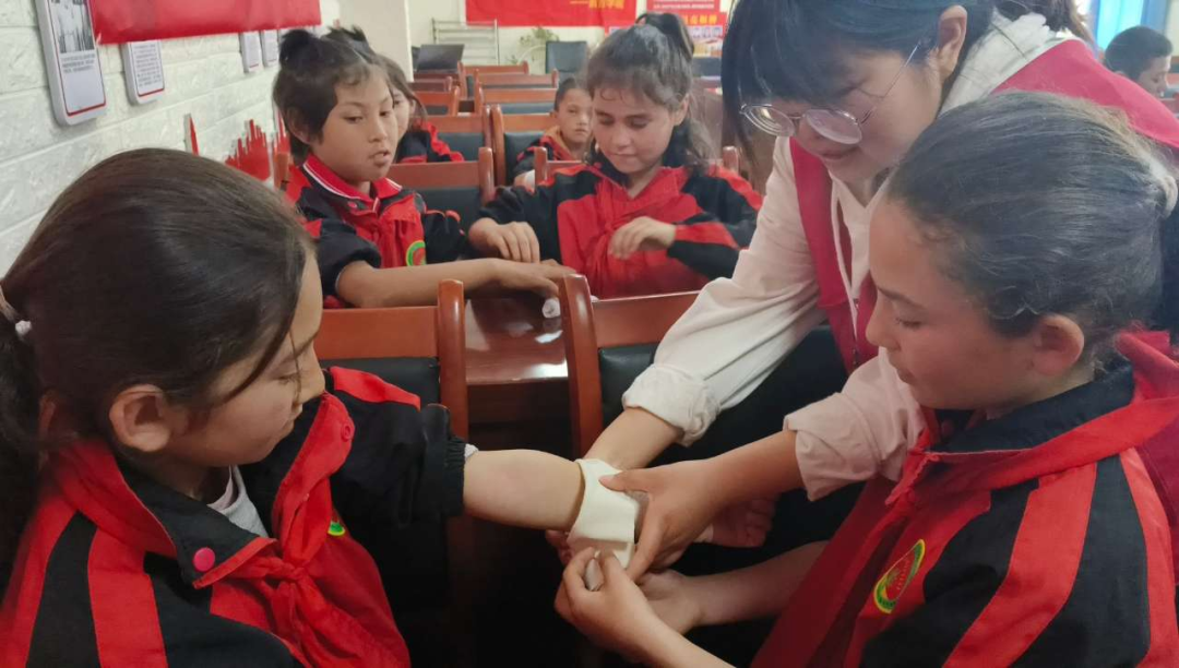 實踐團隊成員對鄉村中小學生開展CPR急救、海姆立克急救和止血包扎知識的講解和操作訓練,楊雯麗、郭欣格兩位同學詳細地介紹并演示了心肺復蘇的操作過程,并對有疑問的孩子進行一對一的講解和指導,使同學們掌握最具有實用基礎的急救方法。