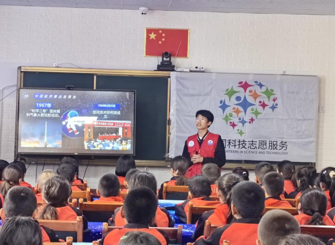 逐夢蒼穹,中國航天人對太空的探索從未止步。實踐團隊成員周王陽同學為孩子們現場講解展板上的航空航天大事記,帶領學生了解我國航天事業的發展歷程以及兩彈一星功勛人物,旨在加強中小學生對航空航天發展史的相關知識的認知與學習,激發對航空航天文化的興趣與愛好。