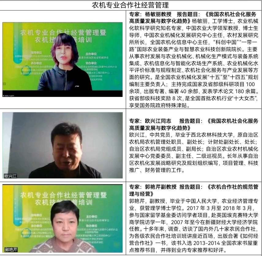 圍繞大會“農機專業合作社經營管理暨農機技能科普培訓”的主題,培訓設置了農機專業合作社經營管理專場和農機技能科普培訓專場。農機專業合作社經營管理專場由中國農業大學中國農業機械化發展研究中心楊敏麗教授,新疆維吾爾自治區農業機械學會監事會主席歐興江,新疆財經大學經濟學院郭艷芹副教授圍分別就“我國農機社會化服務高質量發展與數字化趨勢”“加快農機專業合作社發展,全提升農機社會化服務水平”“合作社規范化經營與管理”進行授課。農機技能科普培訓專場由蘇州極目機器人科技有限公司高級副總裁、總農藝師,新疆極目機器人科技有限公司法人、董事長翟輝,自治區科普教育基地新疆大學工程訓練中心辦公室主任王小榮,新疆農業職業技術學院劉新軍,凱斯紐荷蘭客戶經理胡萬超分別就“數字農業,助力合作社節本增效”“農業智能采收機械研究進展”“農機設備管理與運維”“農業機械國四排放法規與通識”等相關內容授課。