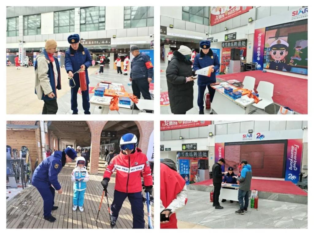 大隊根據不同群體特點分類實施主題宣傳,借力冰雪產業擴大消防宣傳輻射面,結合景區的消防安全特點,消防宣傳人員、消防志愿者、專職消防隊員深入滑雪場、酒店、民宿等場所設置宣傳展臺,給現場游客發放印有消防安全常識的宣傳資料、海報、手提袋等,并通過以案說法的形式講解了近年來在景區常見火災隱患、初期火災處置方法、消防設施使用和火場逃生知識,提醒景區負責人要落實消防安全責任,切實做好日常防火巡查檢查、及時整改火災隱患。