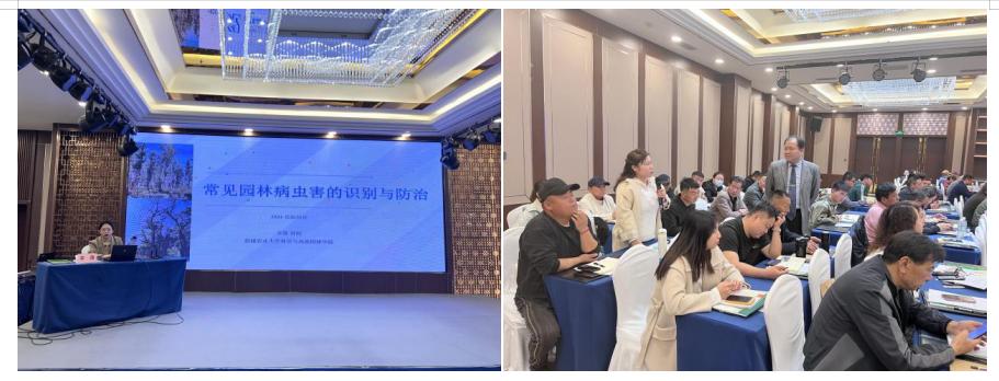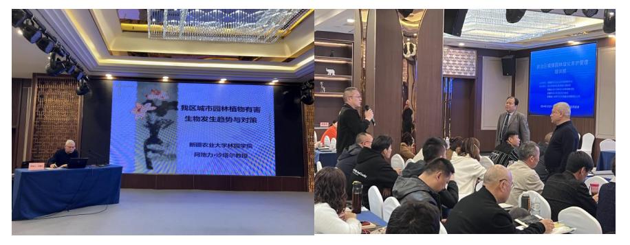 新疆農(nóng)業(yè)大學(xué)林學(xué)與風(fēng)景園林學(xué)院阿地力?沙塔爾教授結(jié)合30多年從事病蟲害防治經(jīng)驗(yàn),從園林植物病蟲害的特點(diǎn)、我區(qū)園林植物有害生物發(fā)生趨勢(shì)、影響主要園林病蟲害種類演替的原因及防治對(duì)策等四個(gè)方面對(duì)學(xué)員進(jìn)行了培訓(xùn)和學(xué)員互動(dòng)交流。