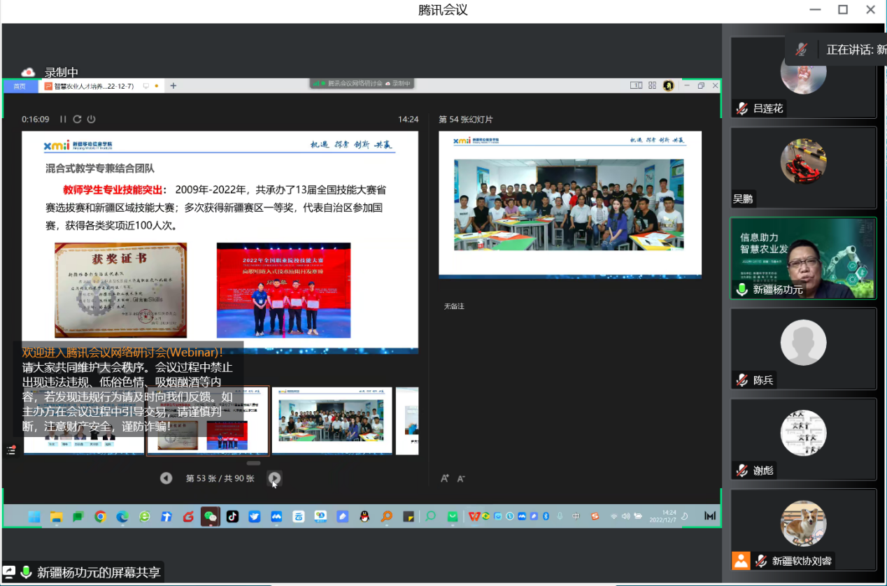在實踐與案例交流環節,新疆七色花信息科技有限公司董事長謝彪以新疆畜牧業信息化應用場景為例,與大家分享了《信息化助力畜牧產業發展》的實踐經驗與典型做法。新疆農業職業學院信息技術分院黨總支書記楊功元教授介紹了學院的人才培養的情況及做法,提出智慧農業背景下職業院校涉農專業人才培養的建議。