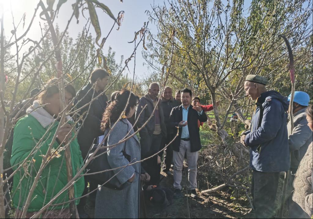 新疆林科院經濟林所副研究員、經濟果林研究專家木合塔爾·扎熱給村民講解新梅、巴旦木、紅棗等新疆特色林果樹種的栽培、營養、逆境生理等方面的理論課。