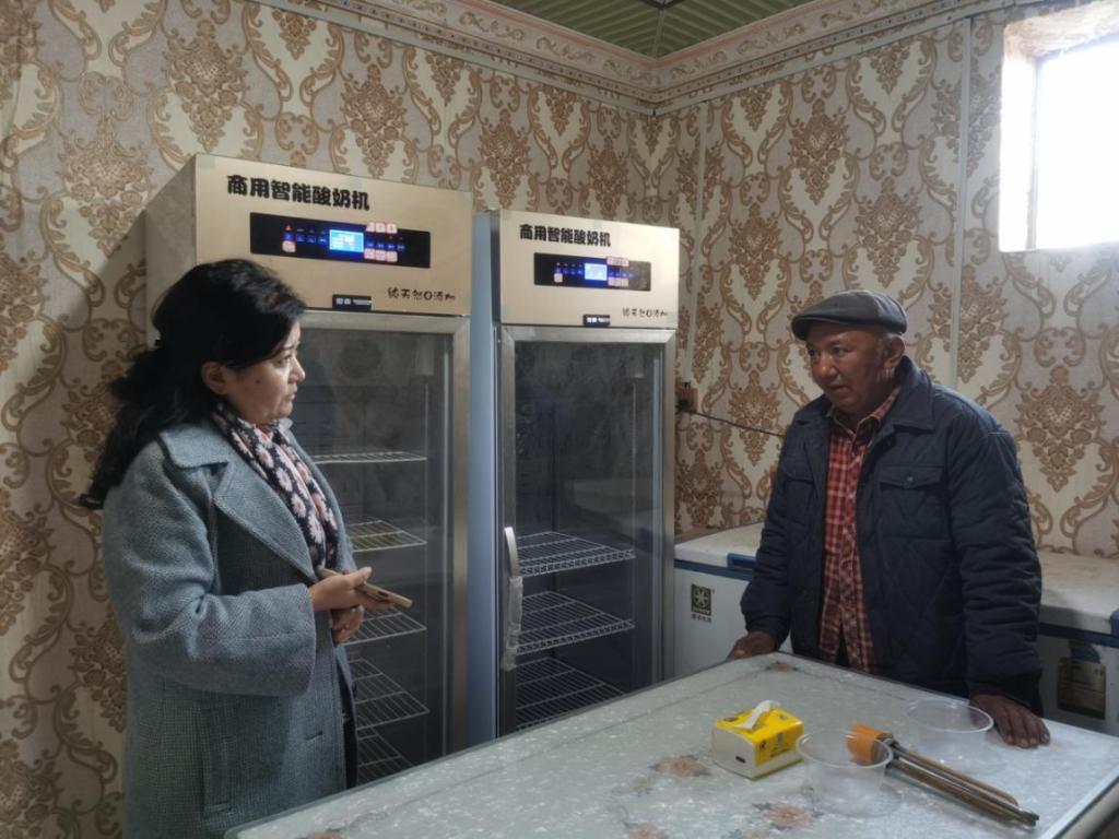 努爾古麗·熱合曼教授和朱曉瑩博士回訪農戶庭院老酸奶作坊并進行指導,對設備進行了調試以及解答了酸奶制作工藝優化方面的問題。