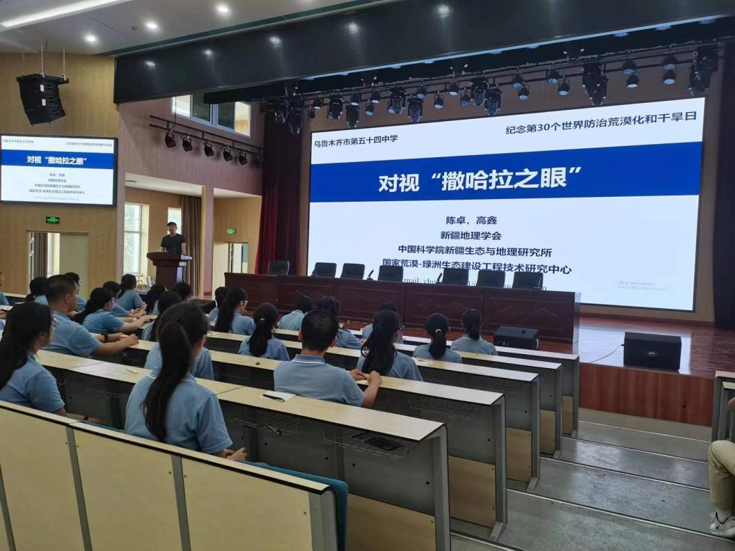 6月28日,為紀(jì)念“6.17”第30個(gè)世界防治荒漠化與干旱日,堅(jiān)定踐行綠色發(fā)展理念,匯聚社會(huì)各界共識(shí),深化對(duì)荒漠化治理知識(shí)的理解,攜手共建美好地球家園,新疆地理學(xué)會(huì)與自治區(qū)科協(xié)攜手中國(guó)科學(xué)院新疆生態(tài)與地理研究所,在烏魯木齊市第54中學(xué)舉辦了一場(chǎng)主題為“凝視撒哈拉之眼”的科普教育活動(dòng),來(lái)自該校的近百名師生參加了此次活動(dòng)。