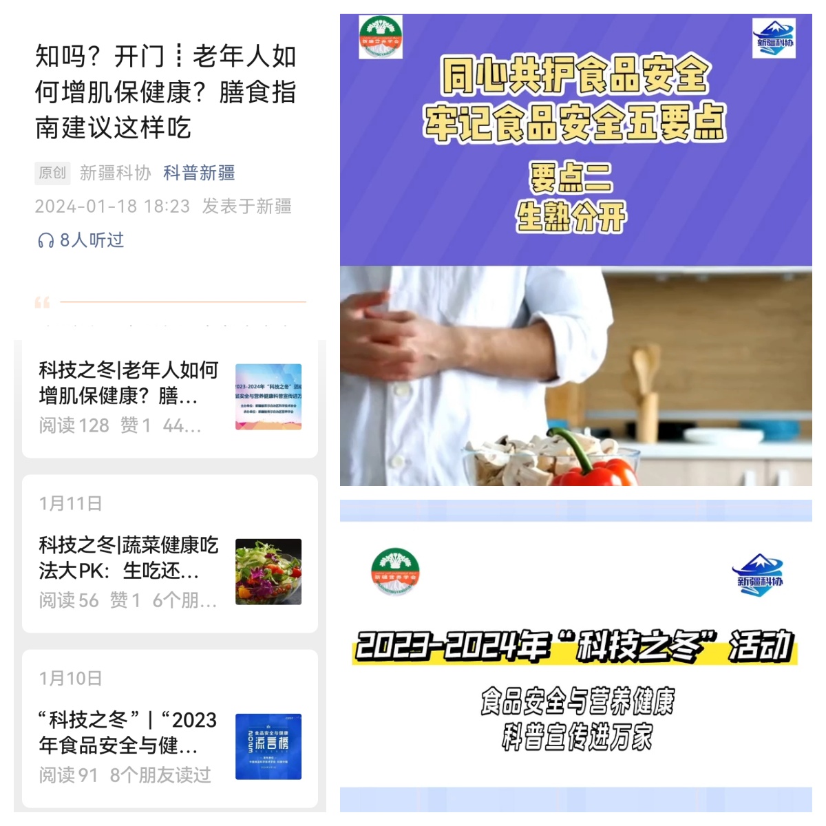 根據(jù)自治區(qū)科協(xié)通知要求,新疆營養(yǎng)學會發(fā)揮專業(yè)所長,因地制宜,及時下發(fā)了“科技之冬”活動方案通知,組織各地州市營養(yǎng)學(協(xié))會、會員單位、理事、會員和志愿者,圍繞“提升全民科學素質(zhì)助力新疆鄉(xiāng)村振興”“尚儉崇信盡責 同心共護食品安全”主題,通過線上線下相結(jié)合的形式組織開展“食品安全與營養(yǎng)健康科普宣教進萬家”主題宣傳活動。