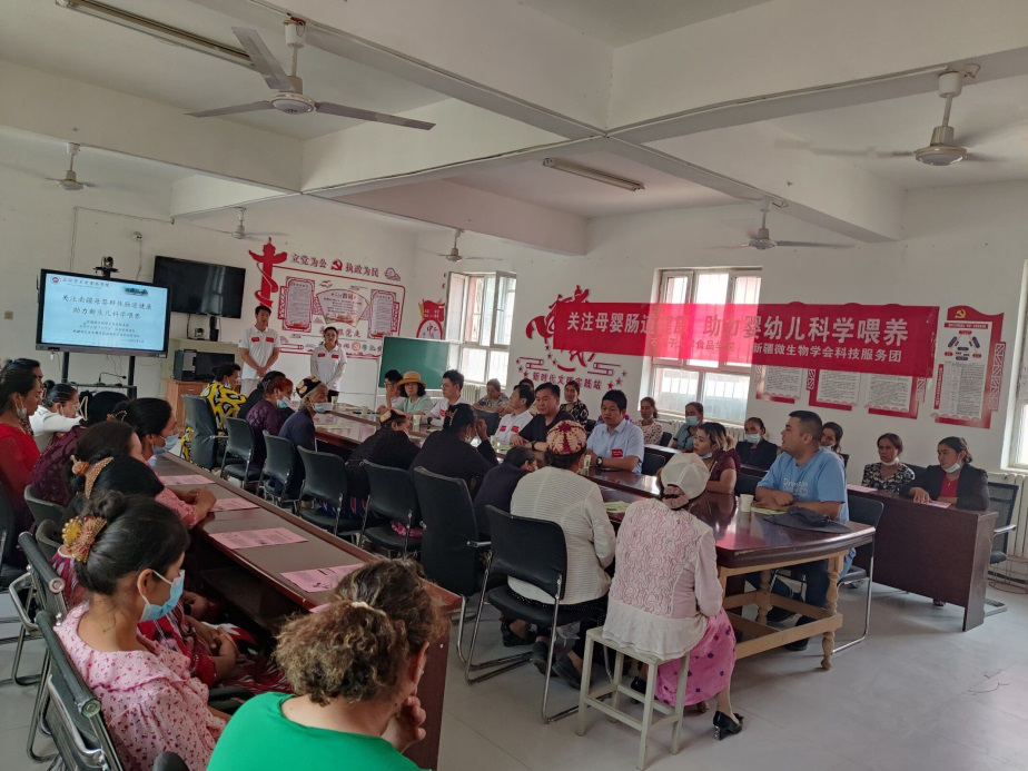 隨后,倪永清教授組織科技服務(wù)團成員向發(fā)放腸道健康與母乳喂養(yǎng)宣傳單,科技服務(wù)團成員王楠斌老師作了“關(guān)注南疆母嬰群體腸道健康,助力新生兒科學(xué)喂養(yǎng)”主題宣講。宣講圍繞腸道微生物是健康的基石,深入遷出的介紹了腸道微生物如何從嬰兒時期就對一生健康的影響,并從《中國嬰幼兒胃腸道舒適調(diào)查研究白皮書》及臨床數(shù)據(jù)解讀了我國嬰幼兒胃腸道健康的問題,結(jié)合科普教育短視頻介紹了母乳喂養(yǎng)的正確方式,強調(diào)新生兒科學(xué)喂養(yǎng)的重要意義。倪永清教授最后總結(jié)到,“孩子是祖國的未來,現(xiàn)在已全面小康社會,大家不僅吃的飽、吃得好,還要吃得健康,這就要求孩子從小科學(xué)喂養(yǎng),健康飲食,真正貫徹落實《“健康中國2030”規(guī)劃綱要》要求”。