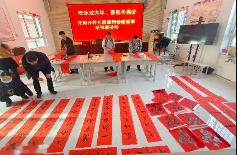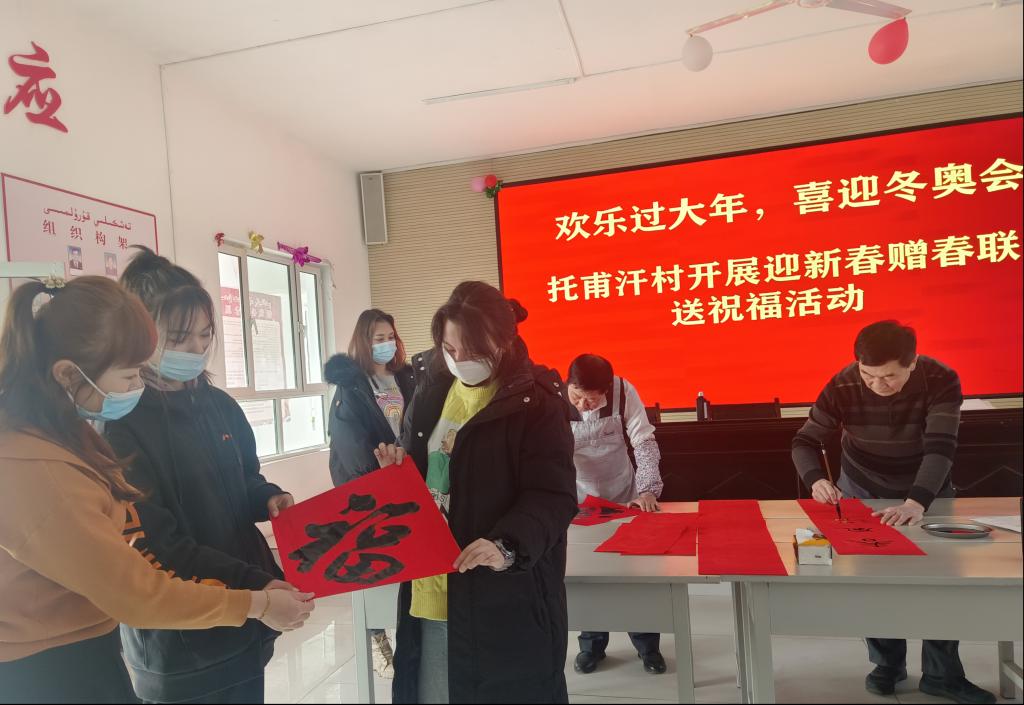 無聯(lián)不成春,有聯(lián)春更濃。“過大年 寫春聯(lián)”是中華傳統(tǒng)民俗文化,是象征吉祥、表達(dá)人民向往美好生活的風(fēng)俗。春節(jié)臨近,年味越來越濃,為了豐富村民文化,喜迎虎年新春,近日,阿克蘇地區(qū)科協(xié)黨組成員、副主席、二級調(diào)研員王敬西帶領(lǐng)科協(xié)下沉干部與駐村工作隊(duì)員為托甫汗村村民開展“迎新春、贈春聯(lián)、送祝福”活動。活動現(xiàn)場邀請到了阿克蘇地區(qū)書法家協(xié)會副主席彭天剛等書法家一行三人為村民寫春聯(lián)。