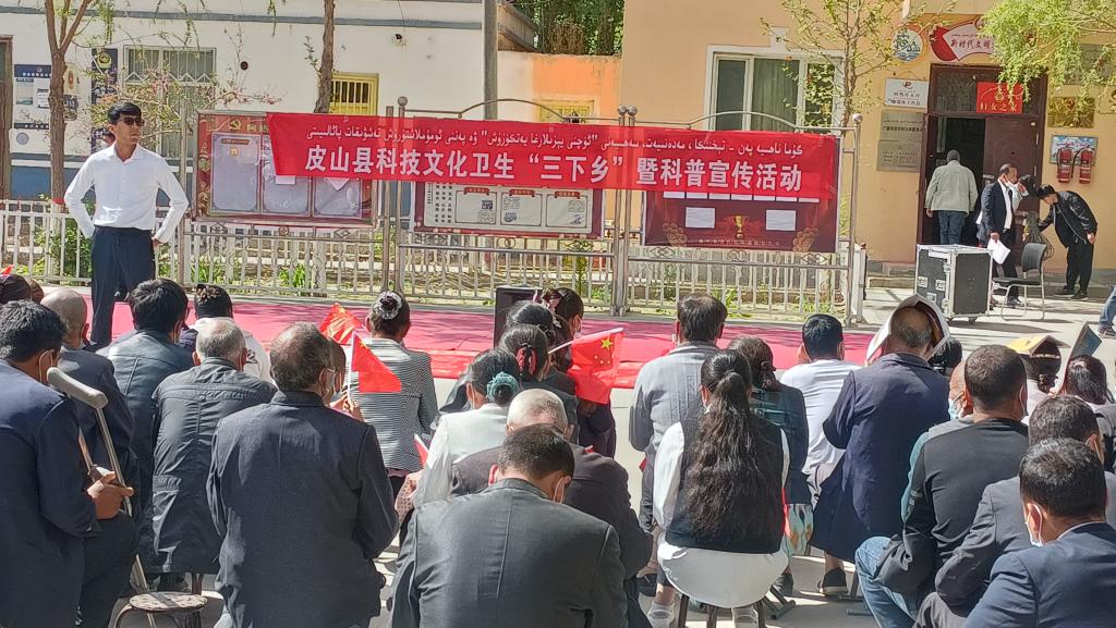 4月11日,皮山縣科協(xié)、宣傳部、文工團(tuán)、司法局等十多家成員單位,利用周一升國旗在科鄉(xiāng)阿熱庫木村開展2022年科技“三下鄉(xiāng)”活動,以科技助力鄉(xiāng)村振興。