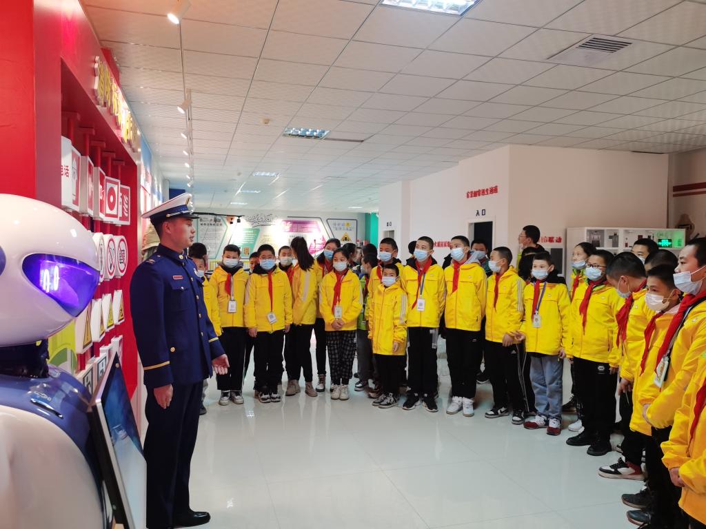 在三樓消防安全展區,科技館工作人員邀請到了塔城市消防大隊的消防員為學生們講解消防器械的使用和消防安全知識。