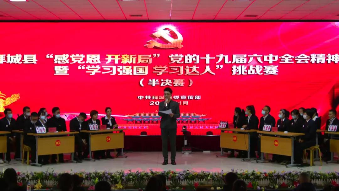 1月22日,拜城縣科協(xié)聯(lián)合縣委宣傳部舉辦“感黨恩開(kāi)新局”黨的十九屆六中全會(huì)精神暨“學(xué)習(xí)強(qiáng)國(guó)學(xué)習(xí)達(dá)人”挑戰(zhàn)賽。來(lái)自拜城縣各系統(tǒng)、各鄉(xiāng)鎮(zhèn)黨(工)委、園區(qū)企業(yè)的選手參加了比賽。