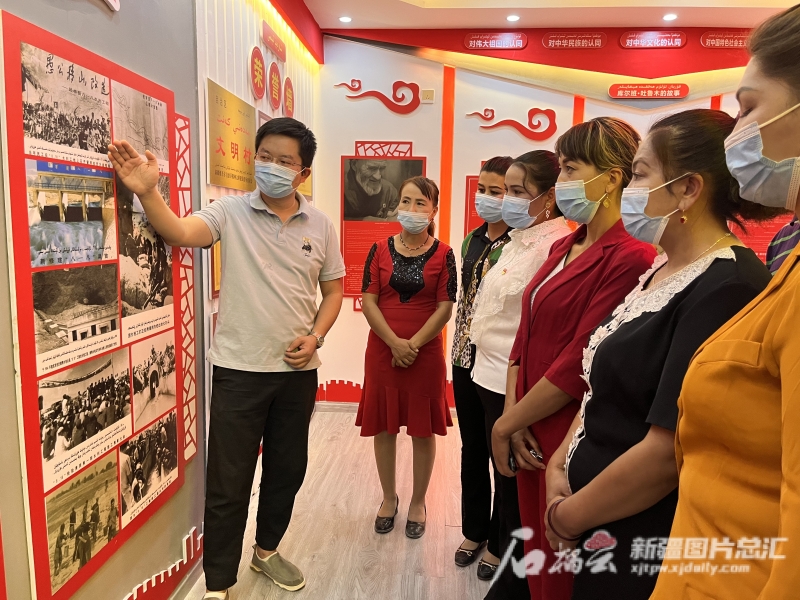 10月1日, 盛凱在民豐縣安迪爾鄉繁榮村村史教育館為村民講解紅色歷史。曲聞博攝