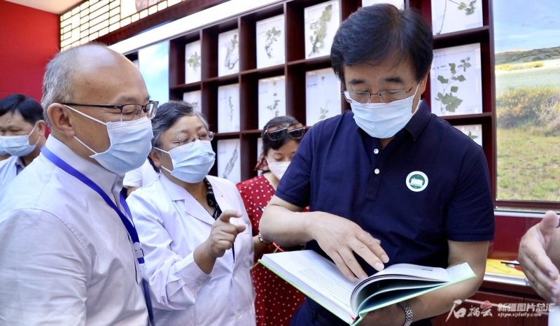 7月17日,在絲綢之路經(jīng)濟(jì)帶核心區(qū)國(guó)際中藥研發(fā)中心,中國(guó)工程院院士王辰(右一)翻看藥材標(biāo)本。石榴云/新疆日?qǐng)?bào)記者 高旭攝