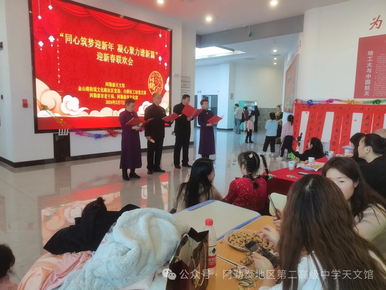 新春將至,為弘揚中華民族傳統文化,增進各民族之間的團結與友誼,2月7日下午,阿勒泰地區科協、阿勒泰天文館(科技館)聯合金山路街道文化路社區黨委、阿勒泰文化路社區黨委、阿勒泰市老干部局、阿勒泰文化館、白樺社工站黨支部,在阿勒泰天文館二樓大廳開展阿勒泰地區“科技之冬”系列活動——“歡迎新春,共游天文”活動。