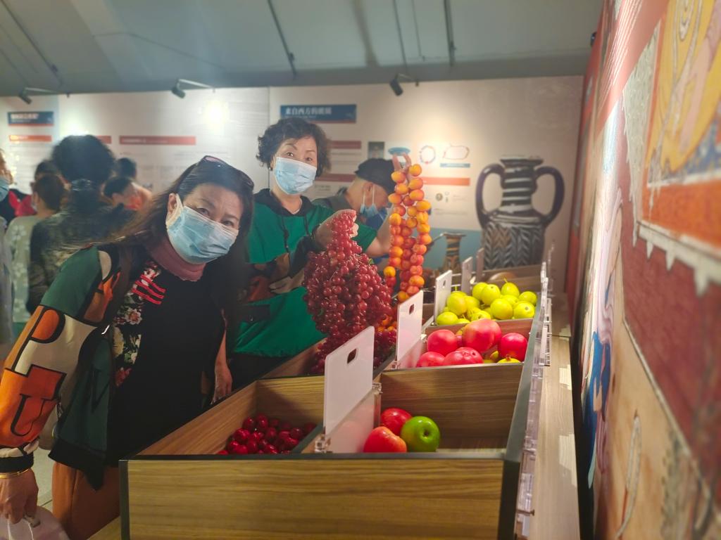 居民群眾在講解員的講解下還深刻了解了當時的文化、經(jīng)濟發(fā)展、還有當時人們的生活。在講解到我們現(xiàn)在所吃的水果及蔬菜大多都是當時通過絲綢之路傳入我們中國的,居民們都很欣喜,拿著葡萄、杏子的模型招呼大家觀看。