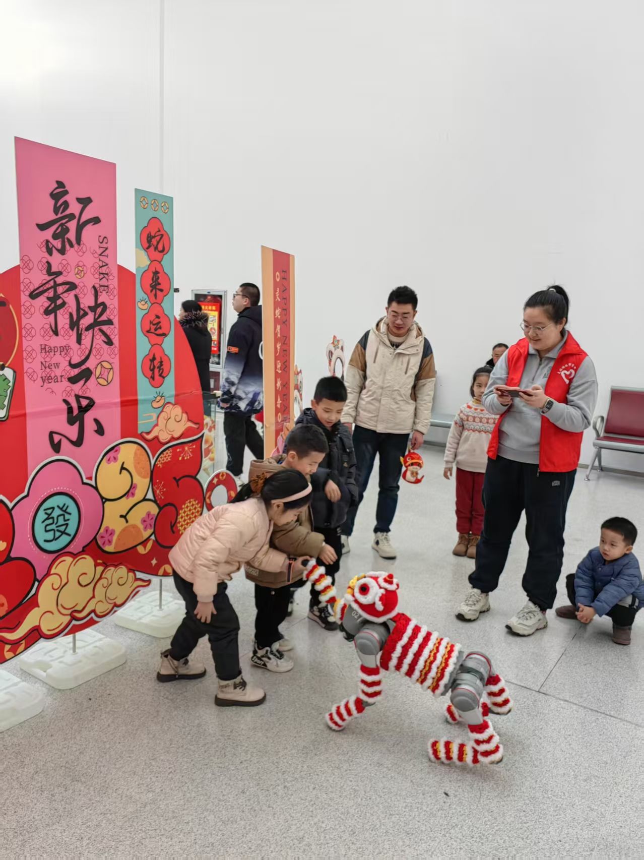 人工智能展區的機器狗互動表演、機甲對戰、無人機編隊飛行等前沿科技展示項目也讓眾多游客驚嘆不已。穿著喜慶服飾的機器狗尤其受到孩子們的喜愛,孩子們紛紛跟機器狗握手。