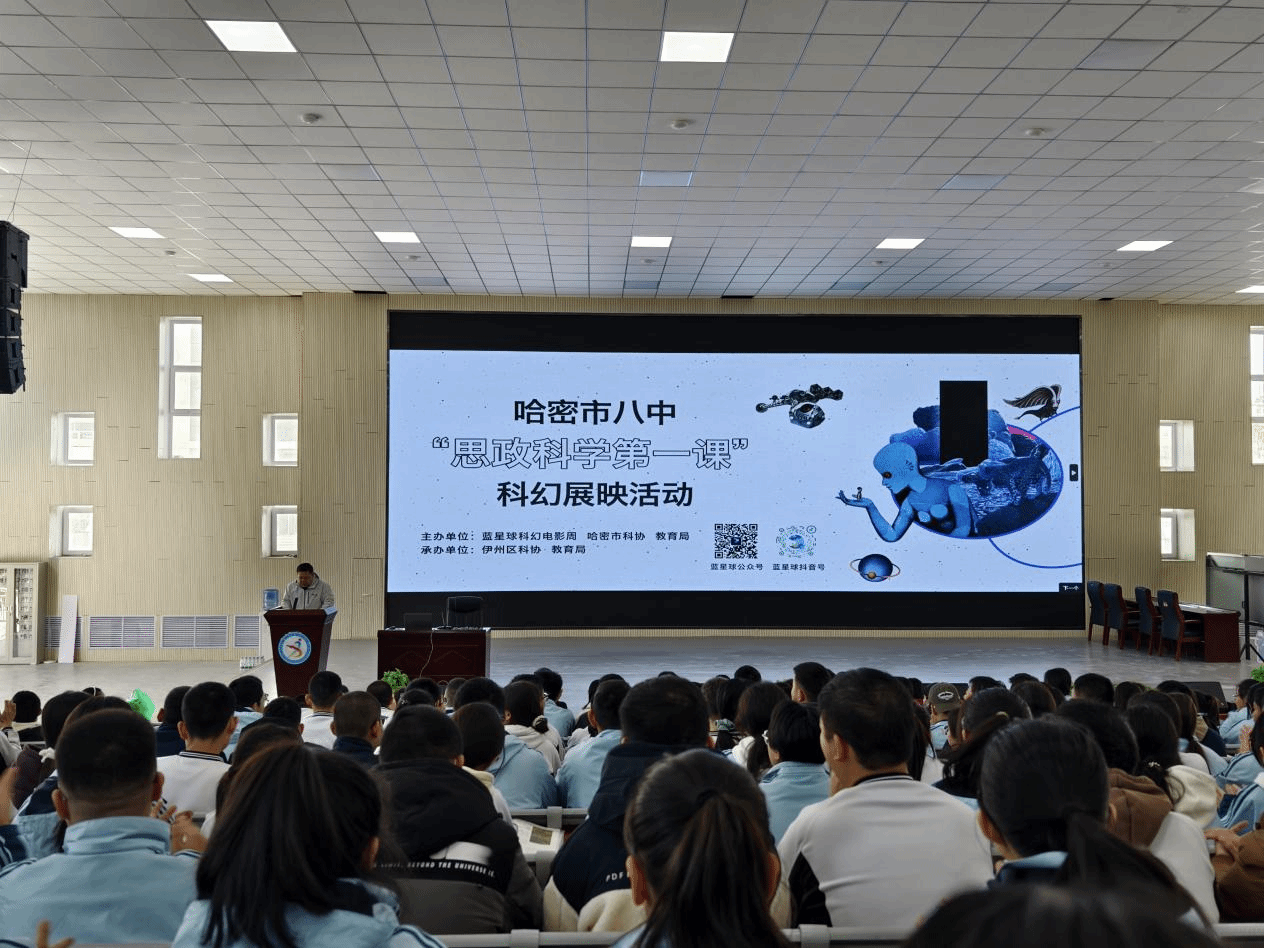 在哈密市第八中學和巴里坤哈薩克自治縣第一中學,藍星球科幻電影周特別精選了3部優秀科幻短片進行展映。影片中天馬行空的想象力、震撼人心的視覺特效以及發人深省的科學哲理,深深吸引了在場的1400余名學生,引發了他們對未來科技和人類命運的思考。展映結束后,辛成江導演走上舞臺,與學生們展開了熱烈的互動。同學們踴躍提問,從電影的創作靈感、拍攝技巧到對未來的暢想,五花八門。導演耐心地解答每一個問題,分享了自己在創作過程中的趣事和心得,還鼓勵同學們大膽發揮想象力,勇敢追求自己的科幻夢想。