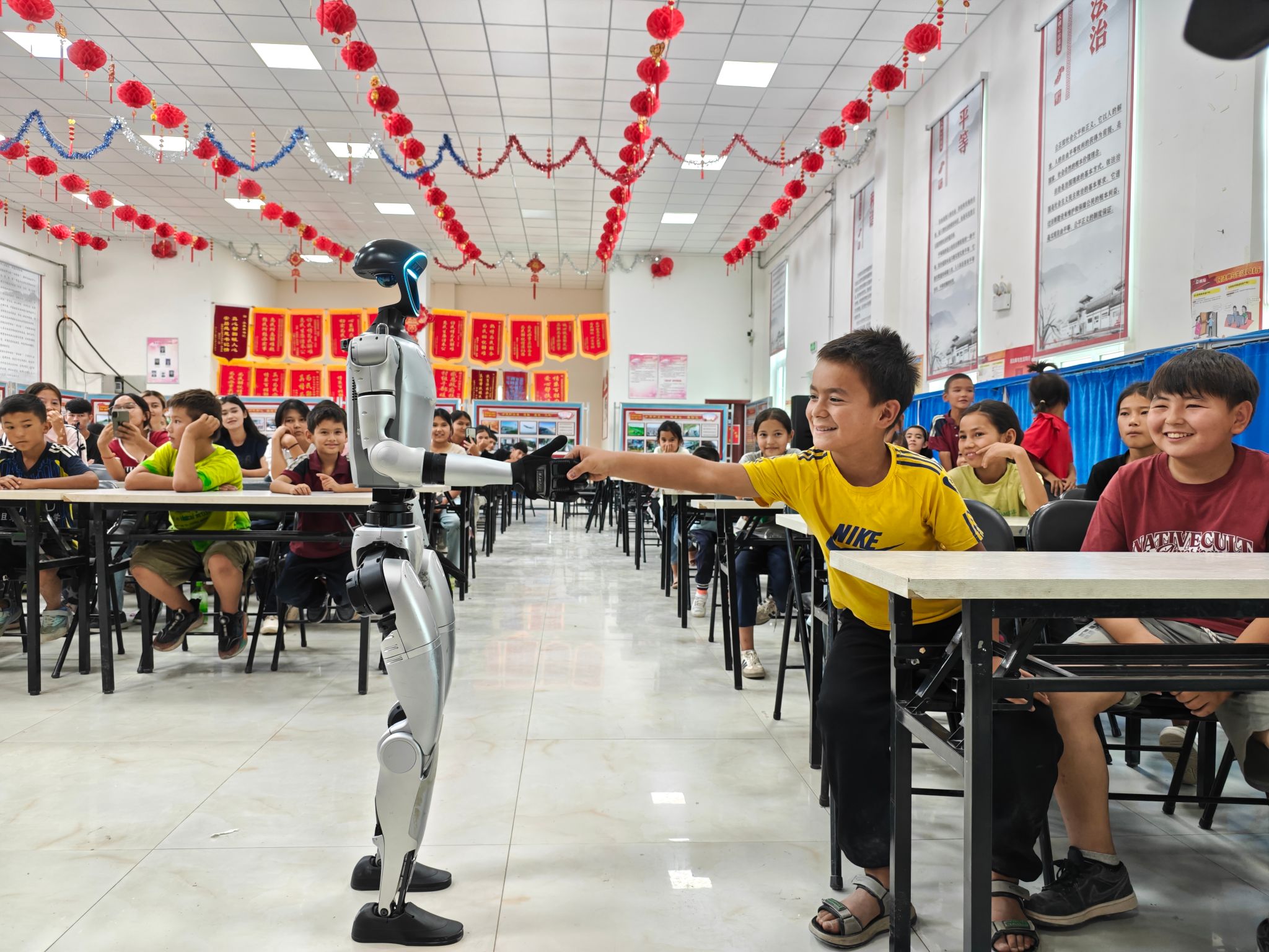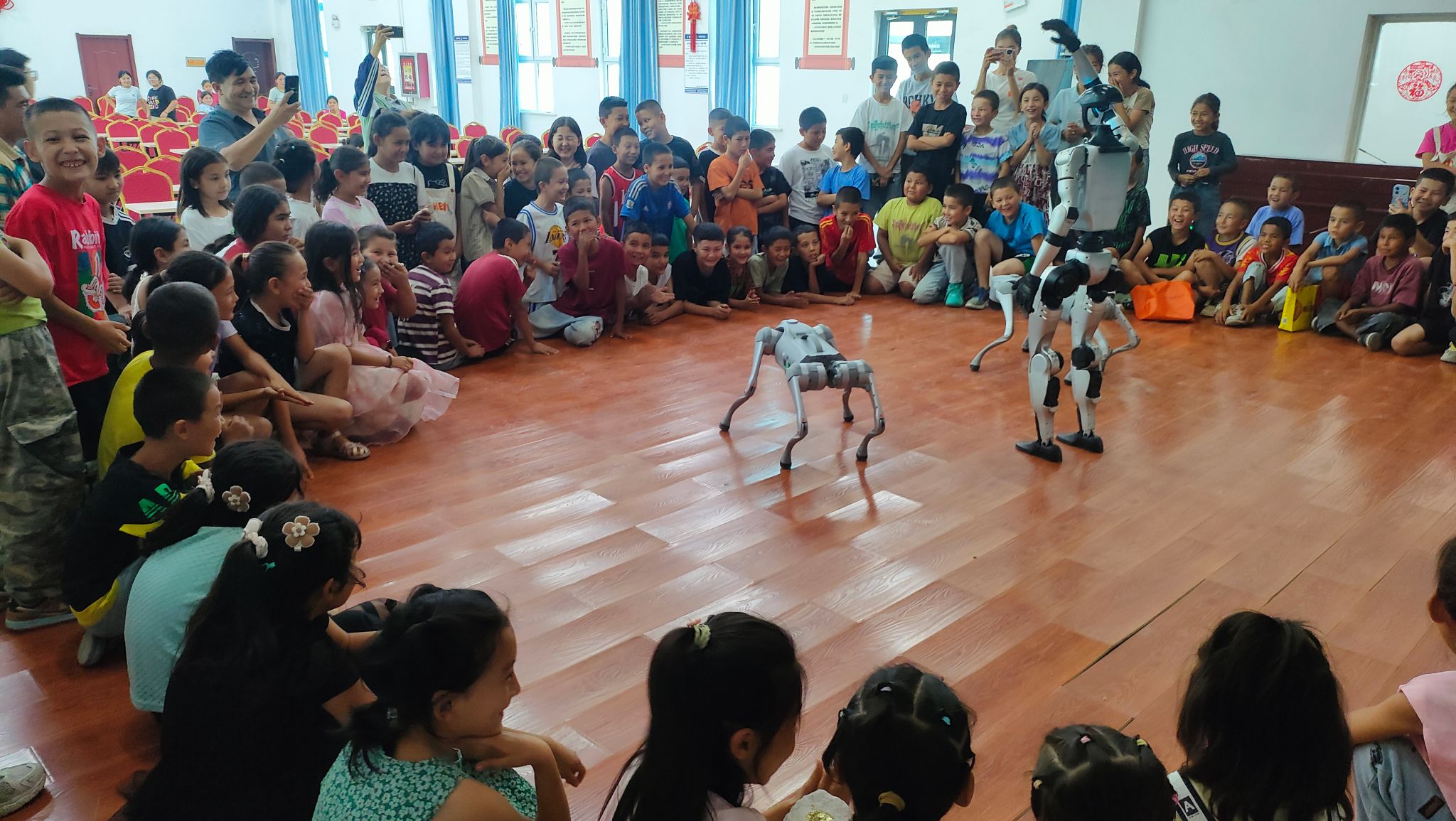 在且末縣托格拉克鄉(xiāng)蘭干村葡萄棚的綠蔭下,歡樂的笑聲此起彼伏。兩只機(jī)器狗隨著音樂節(jié)拍,整齊地做出招手、飛吻甚至利落地前空翻,孩子們“哇”聲一片,眼中滿是驚喜。隨后的倒立行走表演,更讓孩子們目不轉(zhuǎn)睛,眸中仿佛有星光閃爍。